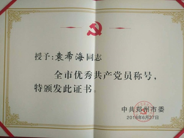 熱烈祝賀公司黨總支組織委員袁希海同志獲得“鄭州市優(yōu)秀共產(chǎn)黨員”榮譽(yù)稱號(hào)