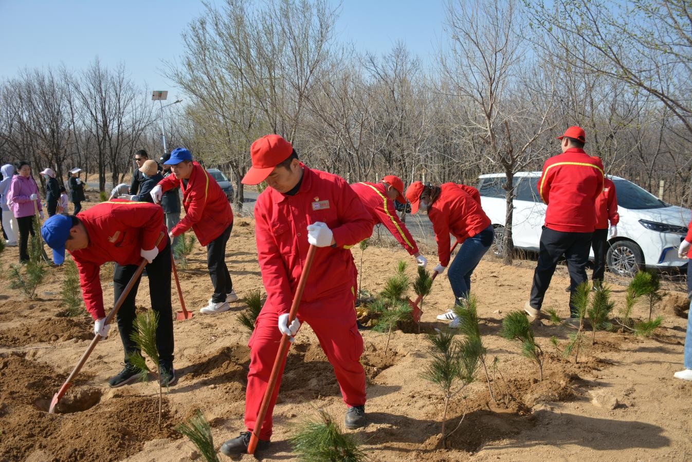 巍峨連綿的青山下,植樹現(xiàn)場火熱而有序,挖坑、扶苗、填土、澆水……春風融融,春日暖暖,大家干勁十足。青山下,一株株新栽種的樹苗迎風挺立,盡顯春日勃勃生機。一排排栽下的新綠映襯著一張張燦爛的笑臉,繪就一幅共護生態(tài)的美好畫卷。