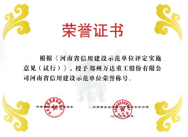 熱烈祝賀鄭州萬達(dá)重工股份有限公司通過了“河南省信用建設(shè)促進(jìn)會”和“河南省企業(yè)信用評審委員會辦公室”共同組織的“河南省信用建設(shè)示范單位”復(fù)審認(rèn)證,被認(rèn)定為“河南省信用建設(shè)示范單位”榮譽稱號!