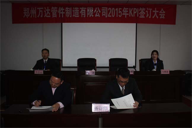 鄭州萬達管件制造有限公司2015年KPI簽訂會于1月30號在公司行政區(qū)會議室隆重舉行,公司班長以上所有管理人員參加了此次簽訂會議。簽訂會分為三級簽訂,即:董事長與總經(jīng)理簽訂、總經(jīng)理與公司各高管簽訂、公司各高管與分管的各部門負責人簽訂,近期,各部門負責人將部門的KPI指標進行分解,與各班組及相關崗位簽訂目標責任書,達到“千斤重擔人人挑,人人肩上有指標”的責任分解領受,確保最終順利完成公司2015年度各項任務和目標。