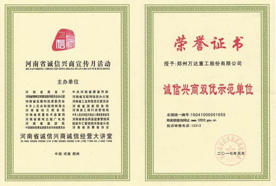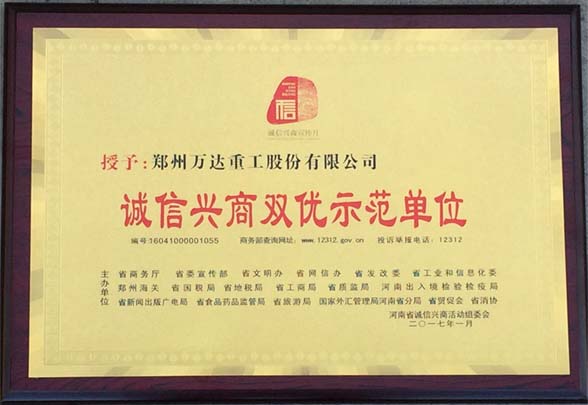 熱烈祝賀鄭州萬達重工股份有限公司及公司董事長、書記何清先生獲的“誠信興商雙優(yōu)示范單