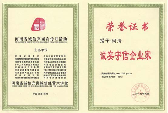 熱烈祝賀鄭州萬達重工股份有限公司及公司董事長、書記何清先生在“河南省誠信興商宣傳月”活動中被河南省商務(wù)廳、中共河南省委宣傳部、河南省精神文明建設(shè)指導(dǎo)委員會辦公室、河南省互聯(lián)網(wǎng)信息辦公室、河南省發(fā)展和改革委員會、河南省工業(yè)和信息化委員會、中華人民共和國鄭州海關(guān)、河南省國家稅務(wù)局、河南省地方稅務(wù)局、河南省工商行政管理局、河南省質(zhì)量技術(shù)監(jiān)督局、中華人民共和國河南出入境檢驗檢疫局、河南省新聞出版廣電局、河南省食品藥品監(jiān)督管理局、河南省旅游局、河國家外匯管理局河南省分局、中國國際貿(mào)易促進委員會河南省委員會、河南省消費者協(xié)會等18個部委聯(lián)合認定為“誠信興商雙優(yōu)示范單位”和“誠實守信企業(yè)家”。