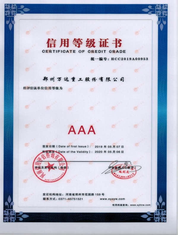 我國(guó)企業(yè)信用評(píng)估的信用等級(jí)采用國(guó)際通行的"四等十級(jí)制"評(píng)級(jí)等級(jí),具體等級(jí)分為:AAA,AA,A,BBB,BB,B,CCC,CC,C,D。同時(shí)也是衡量企業(yè)財(cái)務(wù)能力的重要指標(biāo)體系。(AAA信用等級(jí)意味著信用極好,企業(yè)的信用程度高、債務(wù)風(fēng)險(xiǎn)小。該類(lèi)企業(yè)具有優(yōu)秀的信用記錄,經(jīng)營(yíng)狀況佳,盈利能力強(qiáng),發(fā)展前景廣闊,不確定性因素對(duì)其經(jīng)營(yíng)與發(fā)展的影響極小)。主體信用評(píng)級(jí)是一個(gè)企業(yè)整體實(shí)力、抗風(fēng)險(xiǎn)能力、治理能力及綜合競(jìng)爭(zhēng)力的集中體現(xiàn)。河南信用評(píng)估咨詢(xún)有限公司在信用評(píng)級(jí)報(bào)告中肯定了鄭州萬(wàn)達(dá)重工股份有限公司在較好的業(yè)務(wù)成長(zhǎng)性、凈資產(chǎn)不斷增長(zhǎng)、資本結(jié)構(gòu)穩(wěn)健等方面的優(yōu)勢(shì),綜合評(píng)定鄭州萬(wàn)達(dá)重工股份有限公司信用等級(jí)為AAA級(jí),本級(jí)反映了鄭州萬(wàn)達(dá)重工股份有限公司信用管理基礎(chǔ)完善,信用能力強(qiáng),誠(chéng)信度高,發(fā)展趨勢(shì)樂(lè)觀,綜合能力處于行業(yè)領(lǐng)先水平。