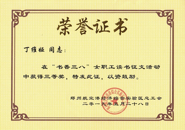 5月28日,鄭州航空港經(jīng)濟(jì)綜合試驗(yàn)區(qū)總工會(huì)下發(fā)表彰通知,在全區(qū)女職工中開展的“逐夢(mèng)新時(shí)代·巾幗綻芳華”為主題的“書香三八”女職工讀書征文活動(dòng)中,我公司員工丁維婭的作品獲得三等獎(jiǎng),并下發(fā)榮譽(yù)證書及鄭州市新華書店購書卡以資鼓勵(lì)。