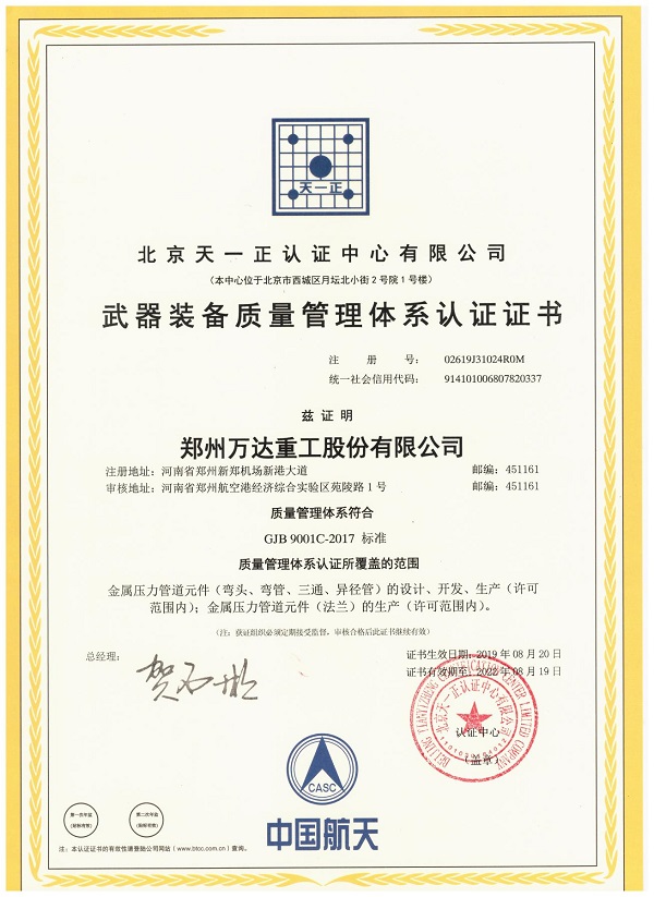 該證書的取得,意味著萬達(dá)重工在軍品產(chǎn)業(yè)的質(zhì)量管理能力和水平達(dá)到了新版國軍標(biāo)質(zhì)量管理體系的要求,也表明了公司生產(chǎn)特種金屬壓力管道元件產(chǎn)品的質(zhì)量符合承擔(dān)軍品任務(wù)的要求,對于公司進(jìn)一步提升產(chǎn)品質(zhì)量管理水平、提升生產(chǎn)服務(wù)能力、開拓軍品市場、滿足軍方對武器裝備的質(zhì)量要求具有十分重要的意義。