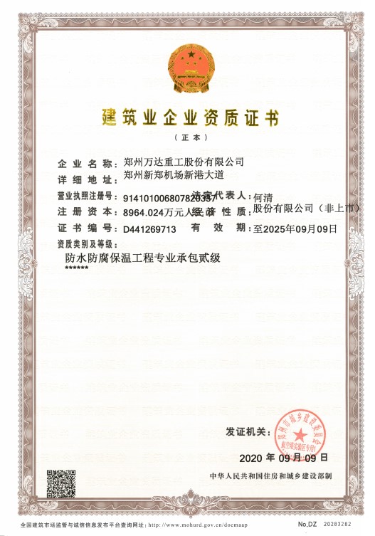 熱烈祝賀鄭州萬達(dá)重工股份有限公司獲得《防水防腐保溫工程專業(yè)承包貳級(jí)資質(zhì)》