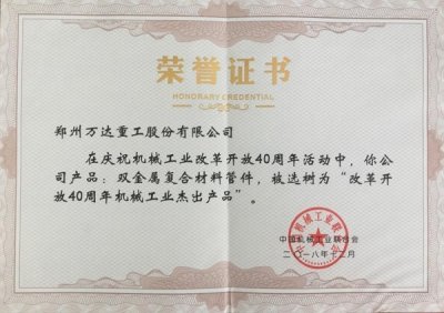 鄭州萬(wàn)達(dá)重工“雙金屬?gòu)?fù)合材料管件”被選樹為“改革開放40周年機(jī)械工業(yè)杰出產(chǎn)品”