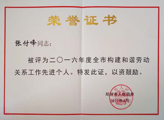 2017/06/28 675 熱烈祝 賀鄭州萬(wàn)達(dá)重工股份有限公司總經(jīng)理張付峰同志被鄭州市人民政府評(píng)為2016年度鄭州市構(gòu)建和諧勞動(dòng)關(guān)系工作先進(jìn)個(gè)人。